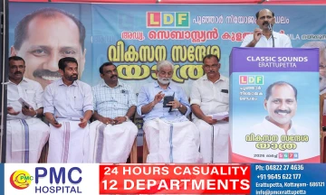 പൂഞ്ഞാര് നിയോജകമണ്ഡലത്തിലെ എല്ഡിഎഫ് വികസന സന്ദേശ യാത്രക്ക് തുടക്കമായി. ഈരാറ്റുപേട്ടയില് നിന്നാരംഭിച്ച യാത്ര സിപിഐ(എം) നേതാവ് മുൻ എം.പി അഡ്വ.കെ. സുരേഷ് കുറുപ്പ് ഉദ്ഘാടനം ചെയ്തു. ജാഥാ മാനേജര് കെ. രാജേഷിന്റെയും വൈസ് ക്യാപ്റ്റന് എം.ജി. ശേഖരന്റെയും നേതൃത്വത്തില് മുന്നേറുന്ന സന്ദേശ യാത്ര ആദ്യ ദിവസം തിടനാടും പിണ്ണാക്കനാടും സ്വീകരണങ്ങള് ഏറ്റുവാങ്ങി.