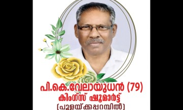 ഈരാറ്റുപേട്ട: കുരിക്കൾ നഗറിലെ കിംഗ്സ് ഷൂ മാർട്ട് ഉടമ വെളിയത്ത് ഭാഗത്ത് താമസിക്കുന്ന പൂളയ്ക്കപറമ്പിൽ വേലായുധൻ (79) നിര്യാതനായി. ഈരാറ്റുപേട്ടയിലെ പഴയകാല വ്യാപാരികളിലൊരാളാണ്. വെളിയത്തെ വീട്ടിലുള്ള മൃതദേഹം ഉച്ചക്കു ശേഷം മൂന്ന് മണിയോടെ തിരുവില്വാമലയിലേക്ക് കൊണ്ടുപോയി നാളെ രാവിലെ പത്ത് മണിക്ക് സംസ്കരിക്കും.